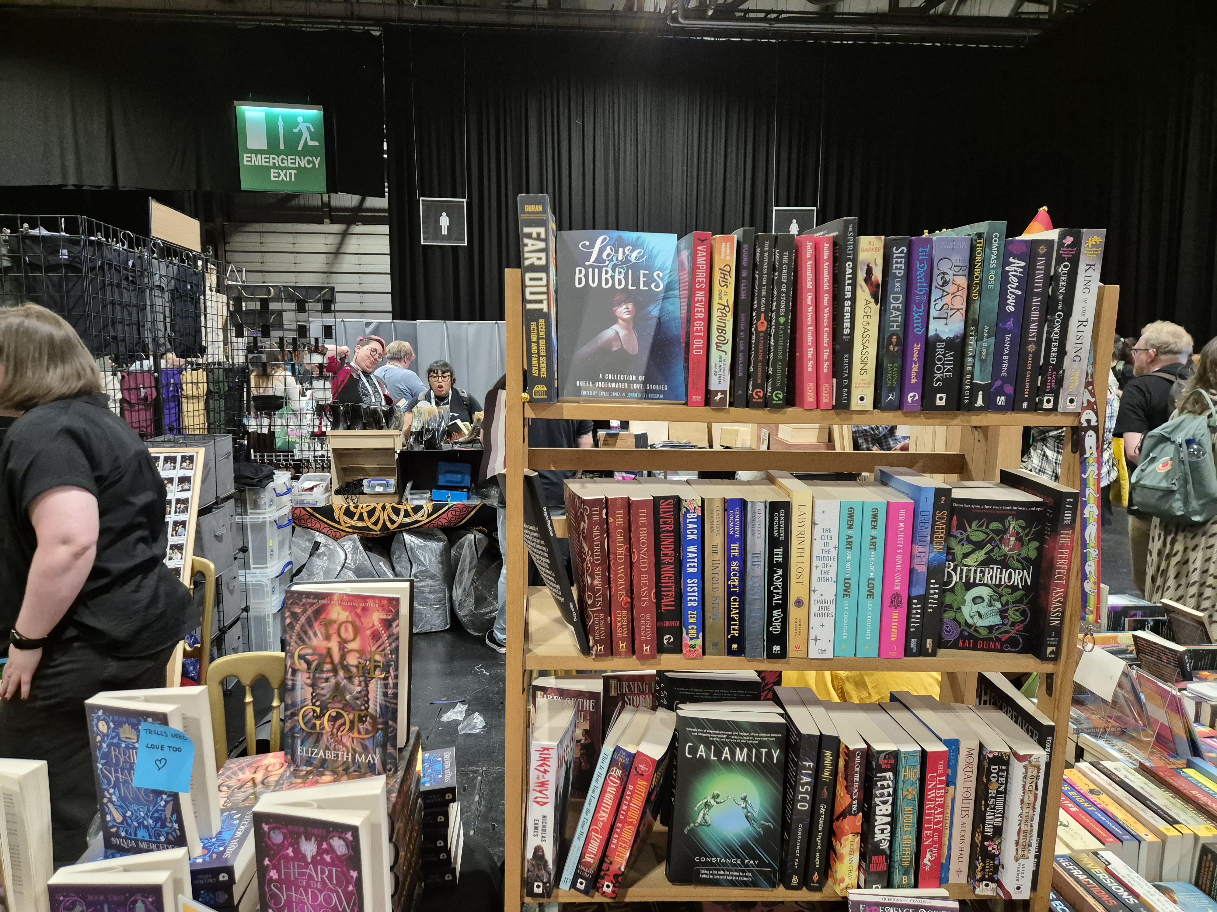 Photo of a book rack on a dealers table, with the cover of “Love & Bubbles” on display on the top shelf. Around it are the backs of lots of other books. A person in black clothes is standing behind the table on the left of the picture, and in the background are more people, more booths, black curtains, and bathroom signs hanging from the ceiling.