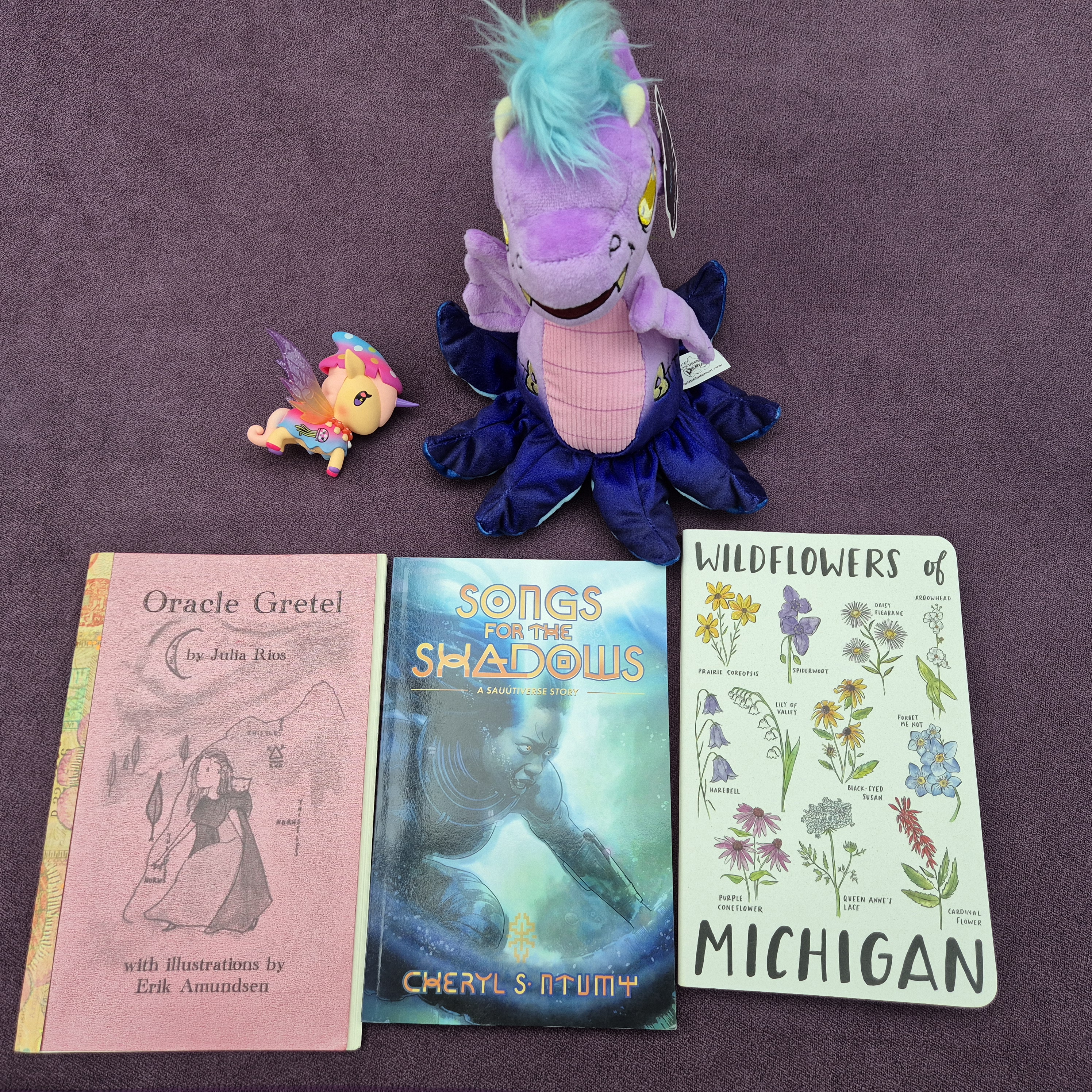 Photo of a small unicorn, a purple dragon plushie with tentacles, a chapbook titled “Oracle Gretel”, a copy of novella “Songs for the Shadows”, and a notebook with “Wildflowers of Michigan”.
