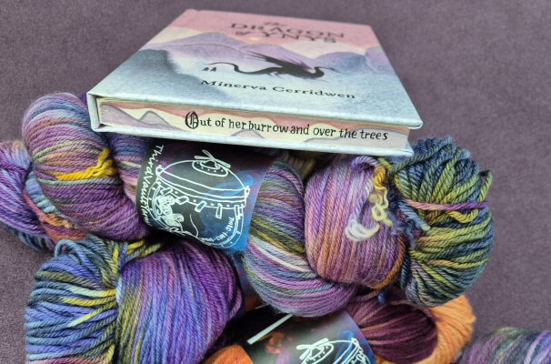Photo of a hardcover of “The Dragon of Ynys” with edges painted to resemble the pink and purple mountains on the cover, with the handlettered text “Out of her burrow and over the trees” on the bottom edge. The book is leaning against a pile of multicoloured yarn, on a dark purple background.