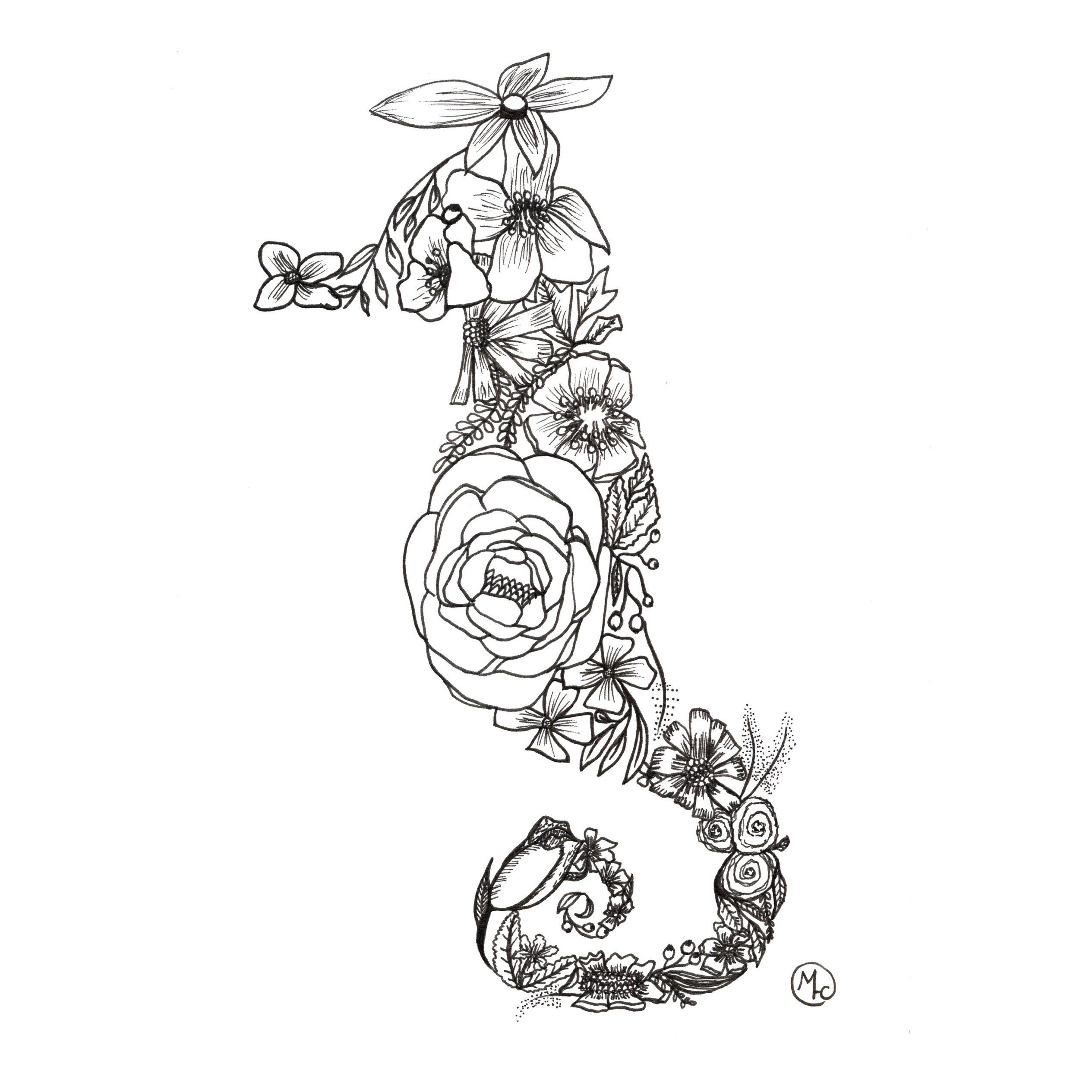 Fineliner drawing of a seahorse silhouette made up of different kinds of flowers.