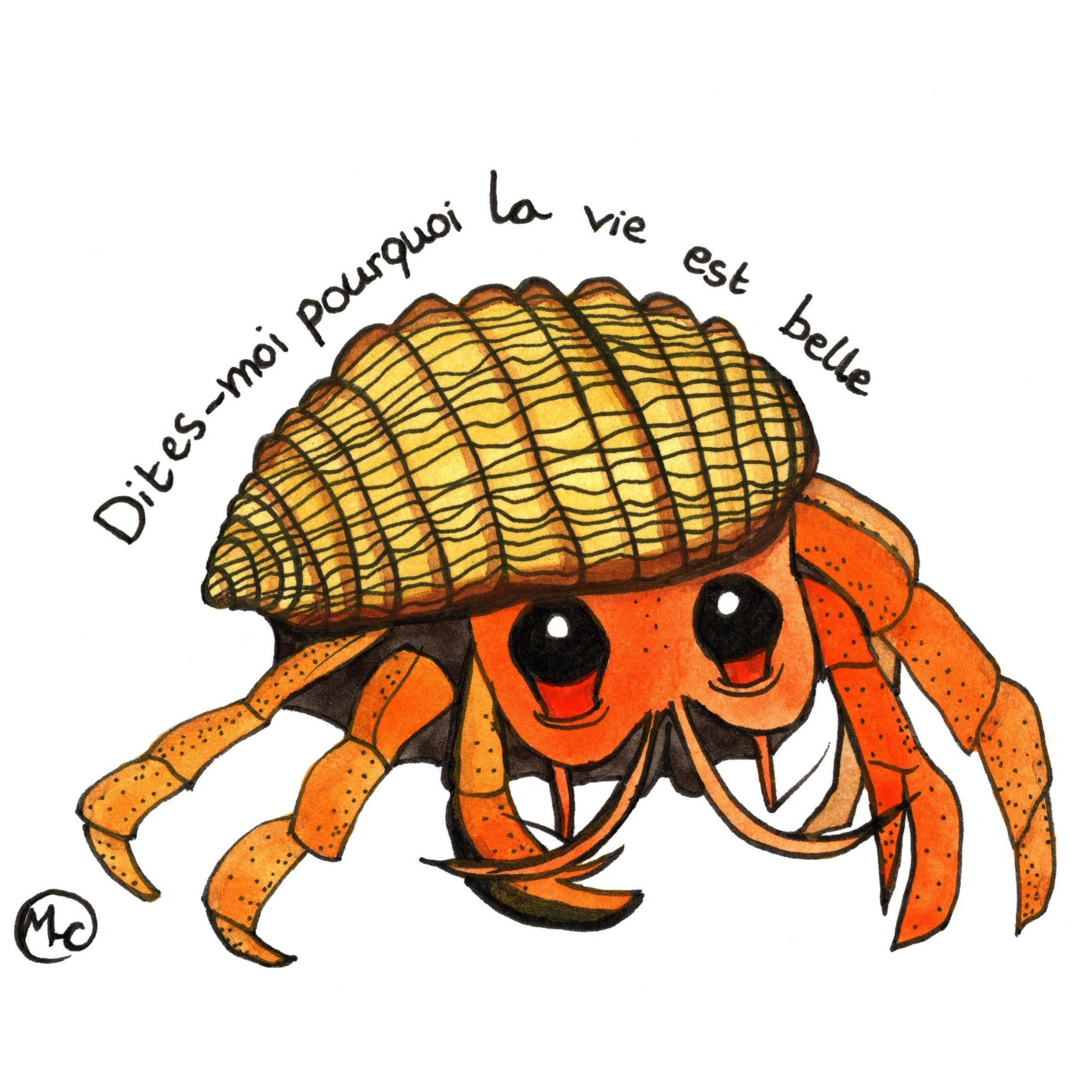 Handdrawn fineliner illustration of an orange hermit crab with large eyes and a yellow shell, with the handwritten text “Dites-moi pourquoi la vie est belle” in black letters in an arc above it.