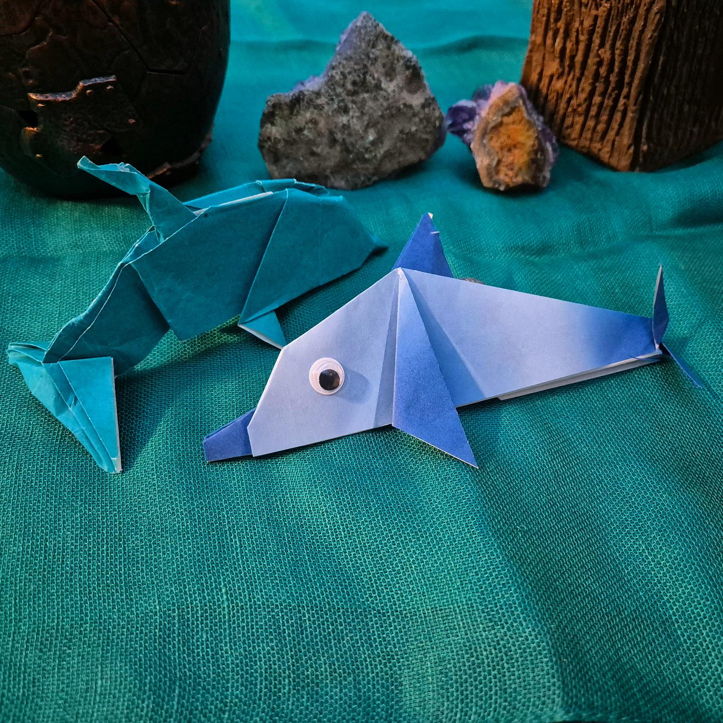 Photo of two different origami dolphins in different shades of blue, one of them looking into the camera with a googly eye. They are lying on a green fabric underground with the impression of rocks behind them.