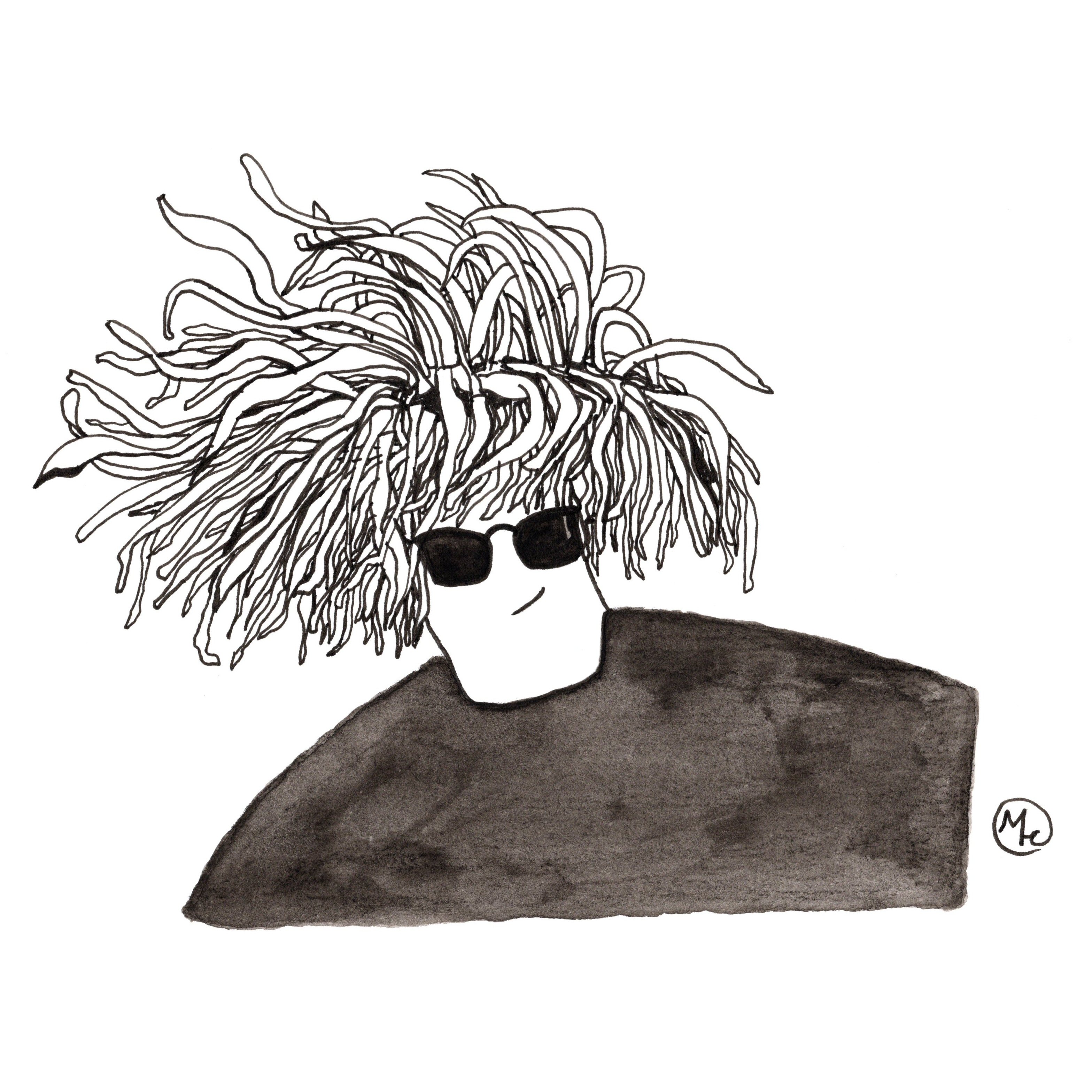 Illustration of a sea anemone wearing sunglasses, handdrawn in black fineliner, sticking out of a surface mound painted in black watercolour.